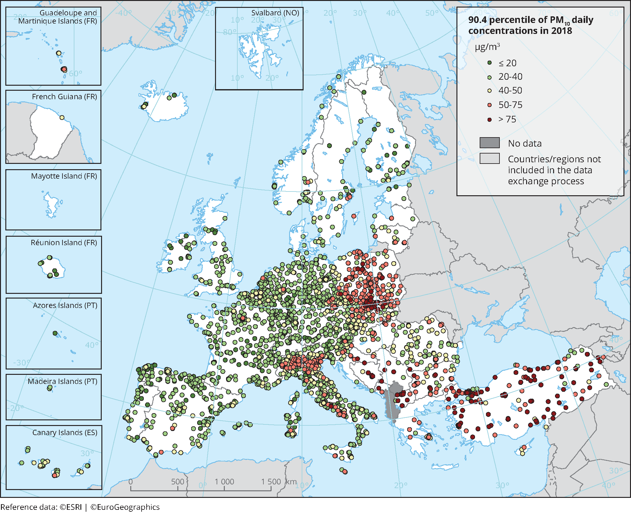 See all EU institutions and bodiesObserved concentrations of PM10 in 2018. The map shows the 90.4 percentile of the PM10 daily mean concentrations, representing the 36th highest value in a complete series. It is related to the PM10 daily limit value, allowing 35 exceedances of the 50 μg/m3 threshold over 1 year. Dots in the last two colour categories indicate stations with concentrations above this daily limit value. Only stations with more than 75 % of valid data have been included in the map. The possibility of subtracting contributions to the measured concentrations from natural sources and winter road sanding/salting has not been considered.