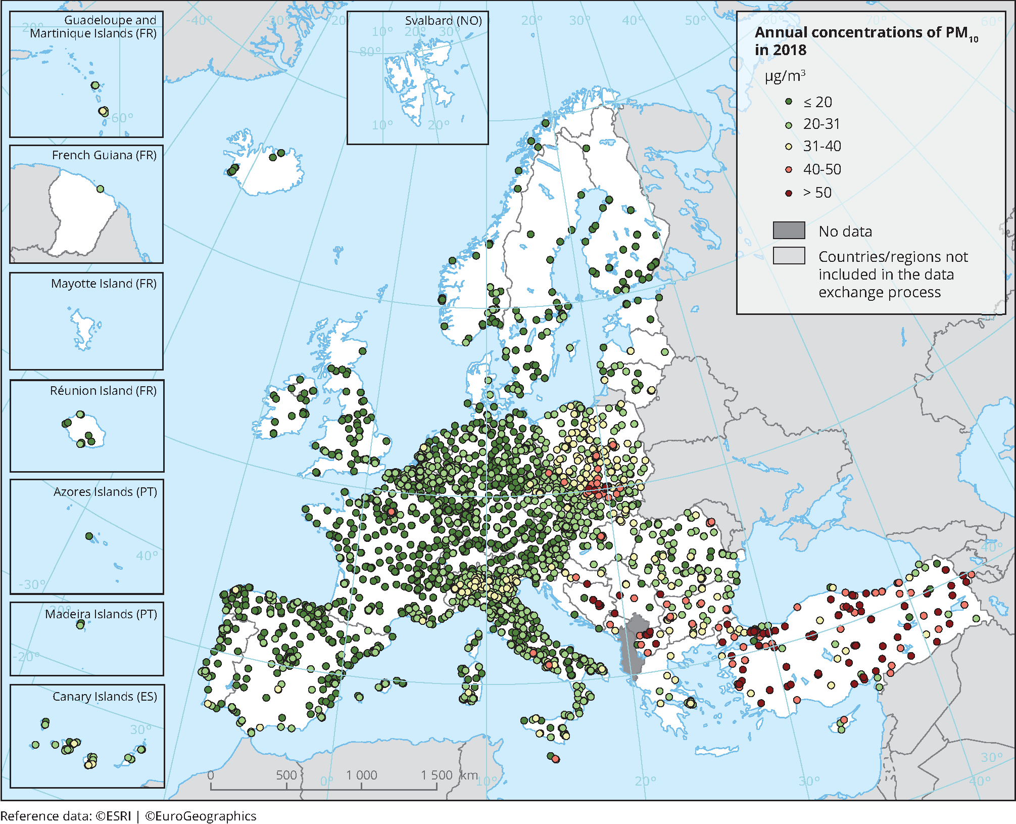 See all EU institutions and bodiesObserved concentrations of PM10 in 2018. The possibility of subtracting contributions to the measured concentrations from natural sources and winter road sanding/salting has not been considered. Dots in the last two colour categories indicate stations reporting concentrations above the EU annual limit value (40 μg/m3). Dots in the first colour category indicate stations reporting values below the WHO AQG for PM10 (20 μg/m3). Only stations with more than 75 % of valid data have been included in the map.
