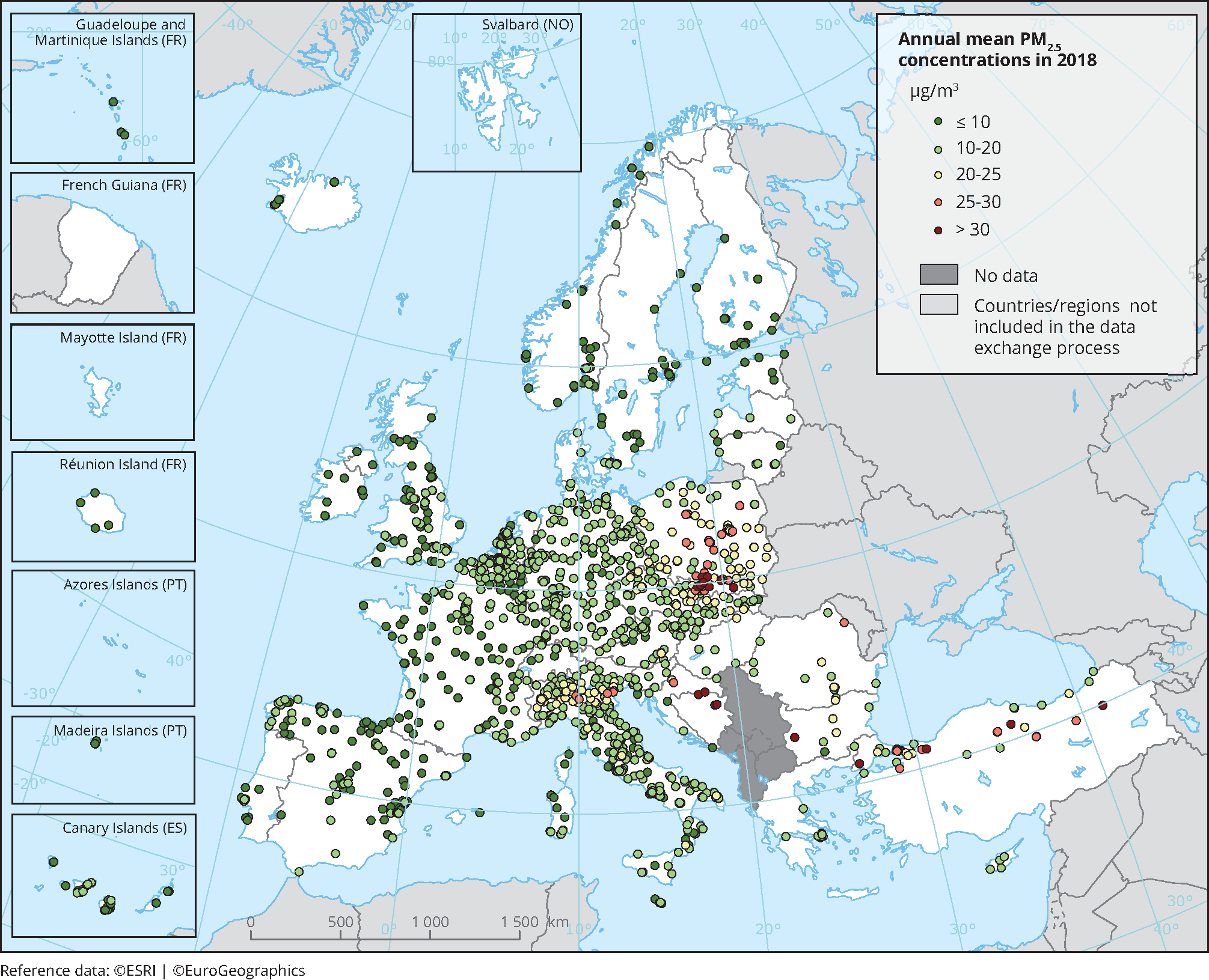 See all EU institutions and bodiesObserved concentrations of PM2.5 in 2018. The possibility of subtracting contributions to the measured concentrations from natural sources and winter road sanding/salting has not been considered. Dots in the last two colour categories indicate stations reporting concentrations above the EU annual limit value (25 μg/m3). Dots in the first colour category indicate stations reporting values below the WHO AQG for PM2.5 (10 μg/m3). Only stations with more than 75 % of valid data have been included in the map.