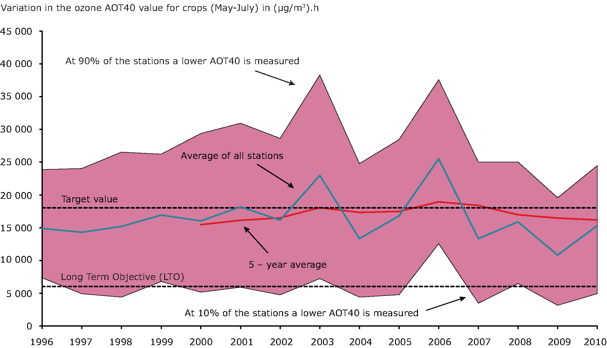 See all EU institutions and bodiesAverage values over all rural stations which reported data over at least eleven years in the period 1996-2010. The black line corresponds to the 5-year averaged value. Variations over Europe in observed values is large, eighty percent of the observations falls with the red shaded area.