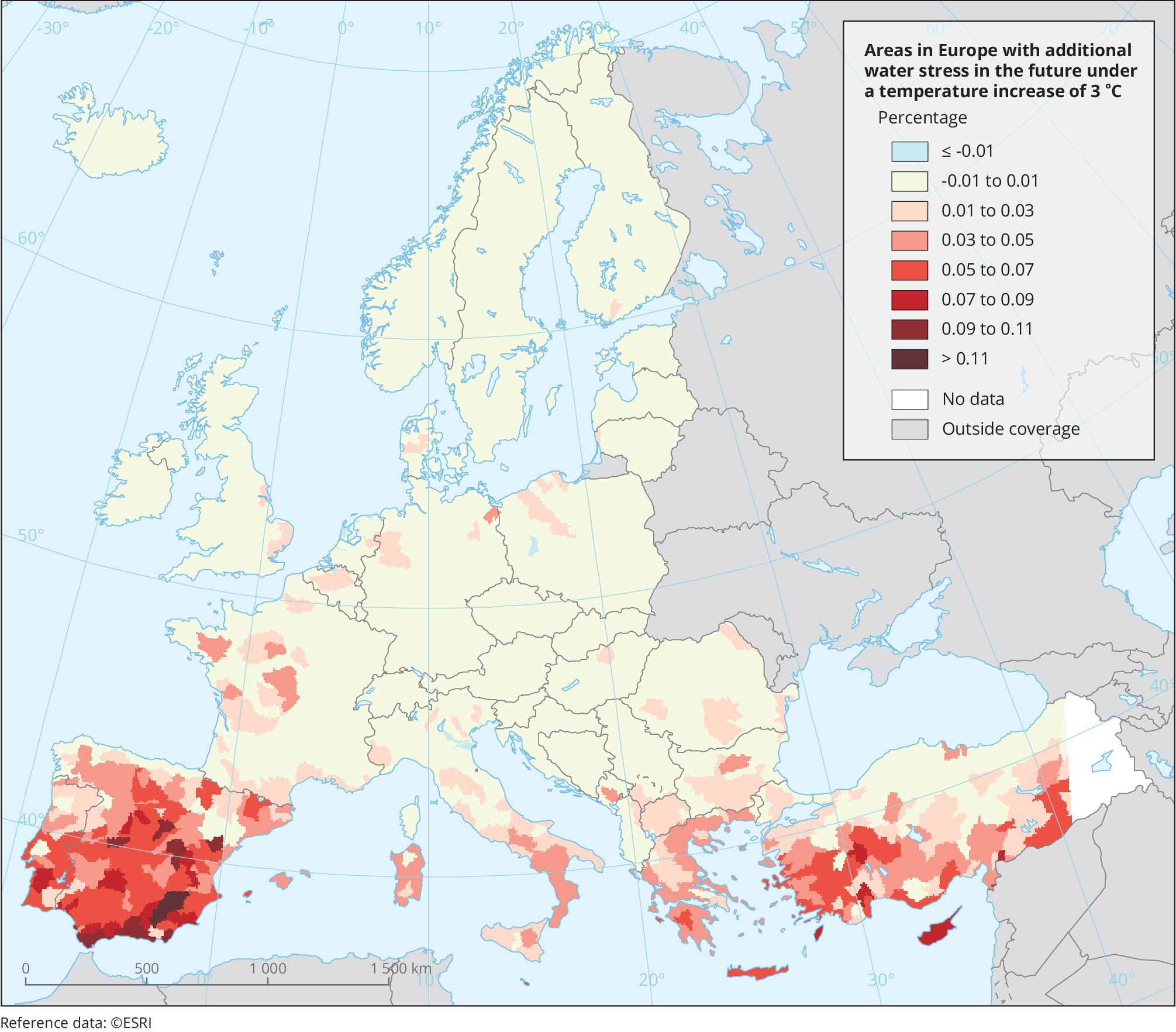 See all EU institutions and bodiesPercentage of water use against water availability under the temperature scenario of 3 degree increase