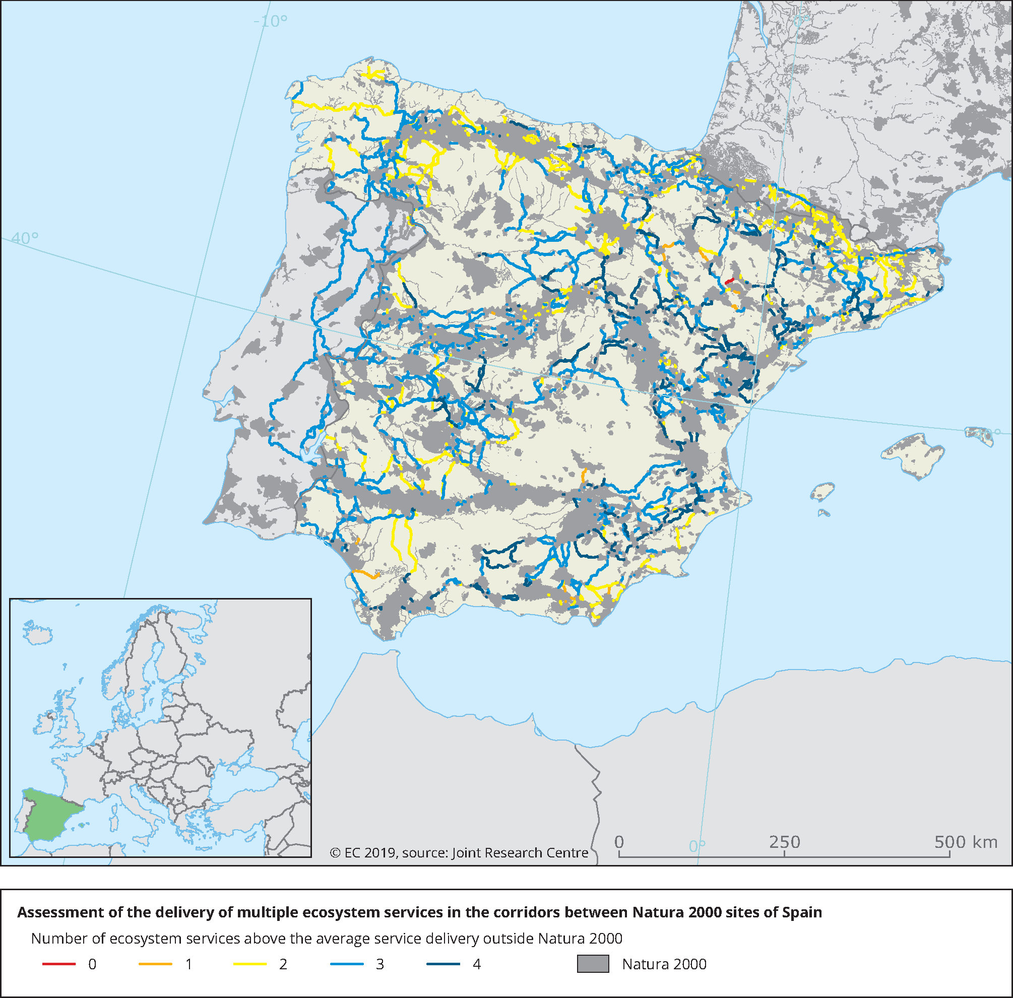 See all EU institutions and bodiesThe map indicates, from red to dark blue, the rating of corridors with an increasing number of ecosystem services (i.e. erosion control, crop pollination, water retention, and outdoor recreation) above the average ecosystem services delivery outside Natura 2000 areas at the national scale of Spain.