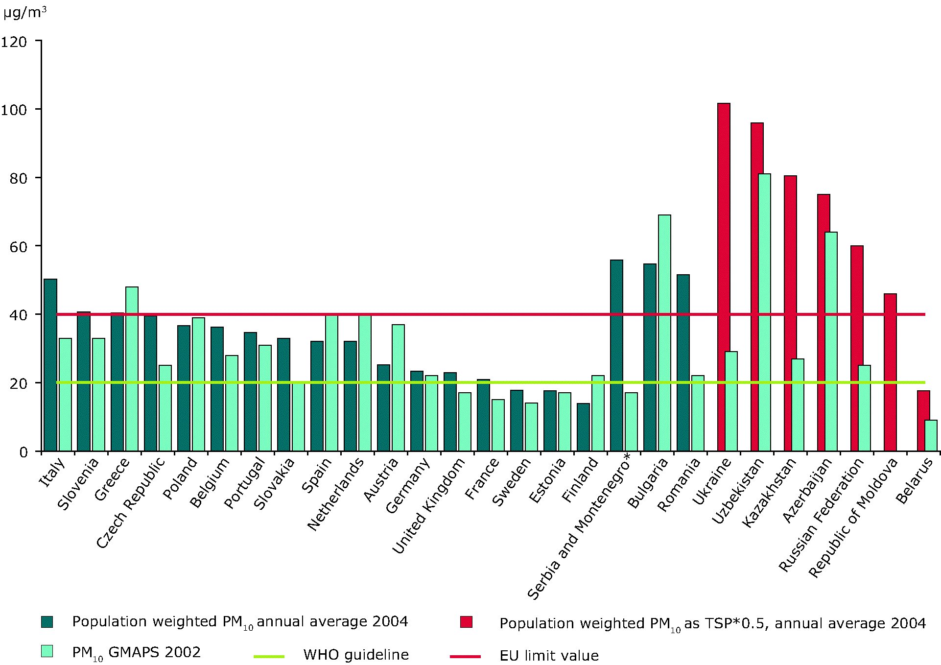 Average annual population-weighted PM10 urban concentrations in WCE and SEE countries, and population-weighted PM10 concentrations based on monitored TSP concentrations in EECCA. Comparison of monitored data with PM10 concentrations modelled by the Global Model of Ambient Particulates (GMAPS)