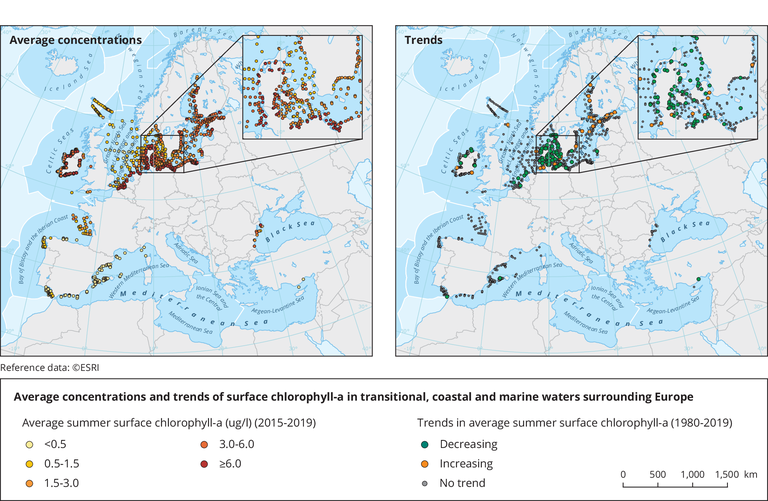• Average chlorophyll-a concentrations were calculated using data from observations in summer (May to September) from the upper 10m of the water column, in locations with annual data for the last 5-year period (2015-2019), transformed to the logarithmic scale.