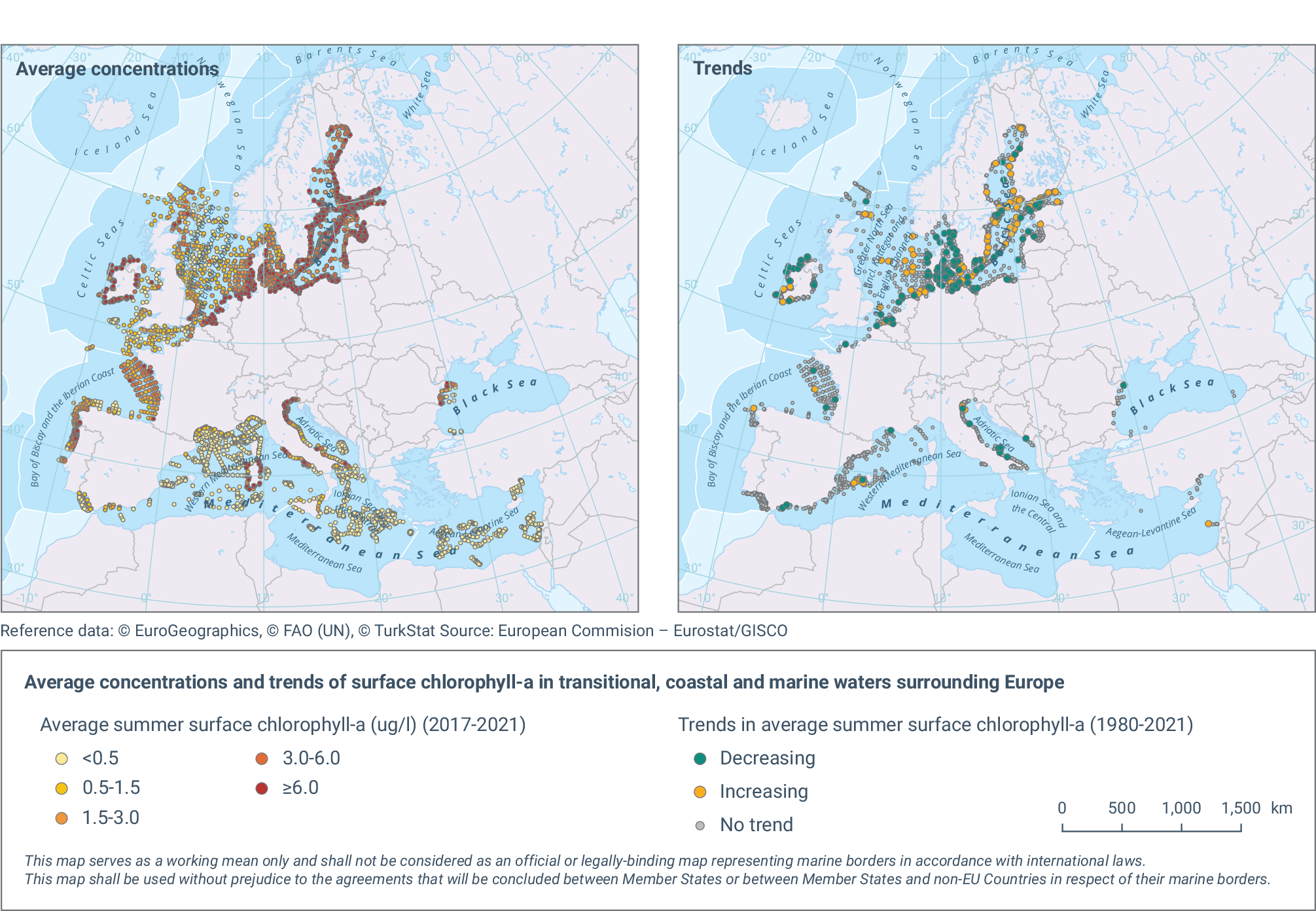 • Average concentrations of chlorophyll-a (µg/l) and trends were calculated using data from observations in summer from the upper 10m of the water column, in locations with annual data for the last 5-year period (2016-2021).