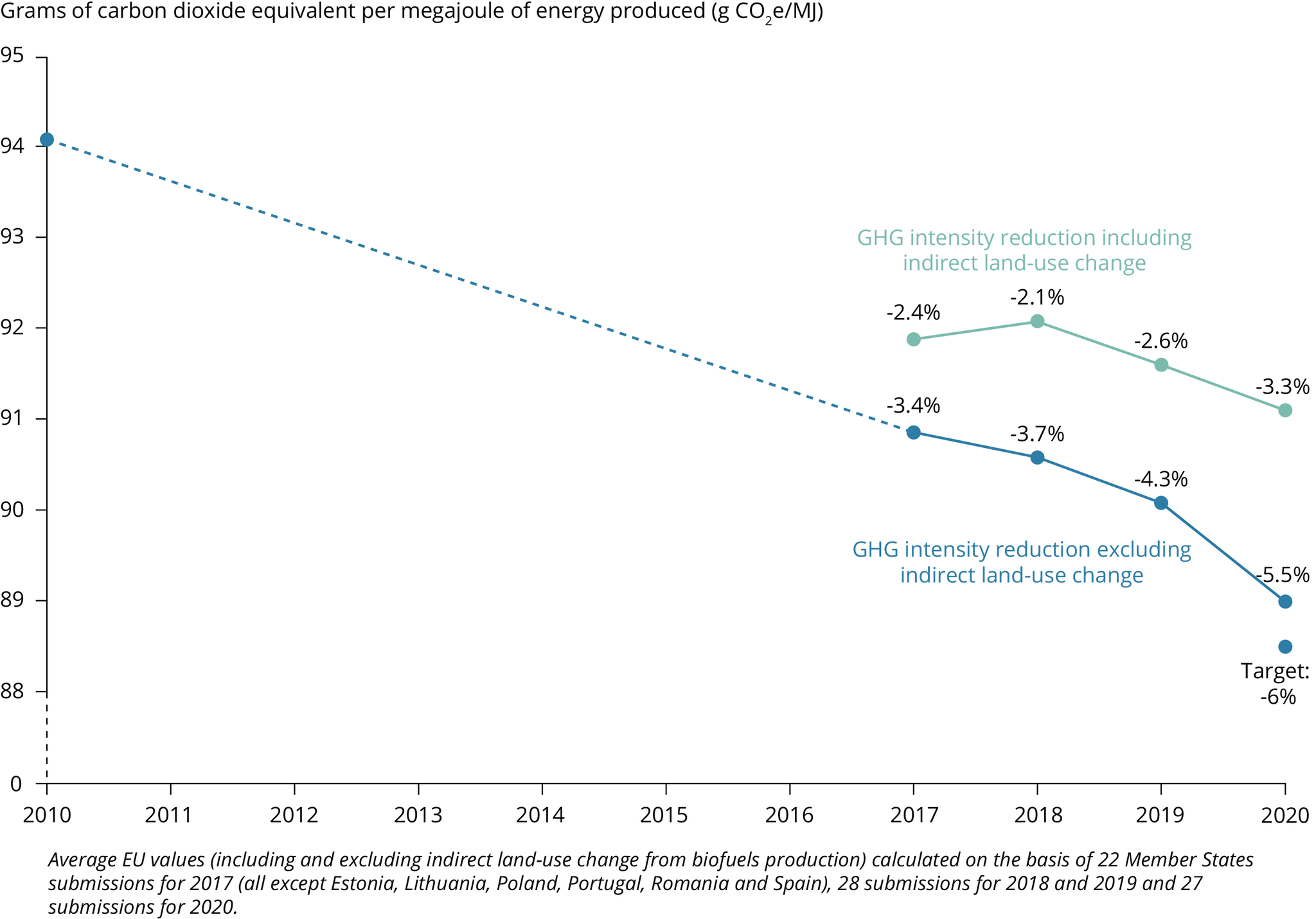 Average EU values (including and excluding indirect land-use change from biofuels production) calculated on the basis of 22 Member States submissions for 2017 (all except Estonia, Lithuania, Poland, Portugal, Romania and Spain), 28 submissions for 2018 and 2019 and 27 submissions for 2020.