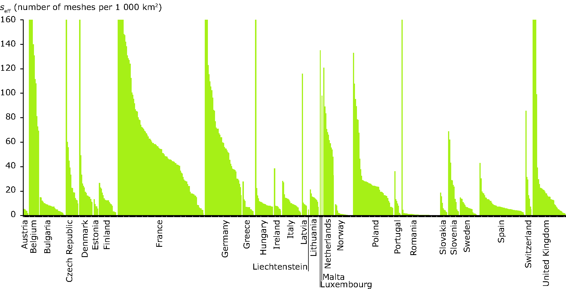 See all EU institutions and bodiesEffective mesh density values by NUTS-X region for Fragmentation Geometry FG-B2 in 2009. Fragmentation geometry has been created from input data (TeleAtlas roads/rails, CLC urban classes, mountain areas / mountain ridges based on Nordregio and WorldClim data and rivers/lakes based on Catchment Characterisation and Modelling (CCM) v.2 database and CLC database) and landscape fragmentation metrics (Jaeger 2000) has been calculated.