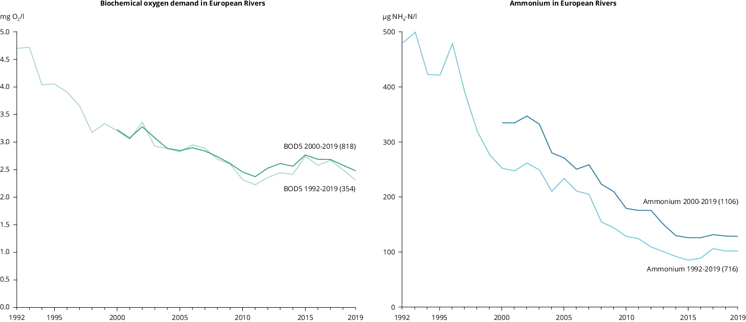 The data series are calculated as the average of annual mean concentrations for river sites in Europe. Only complete time series after inter/extrapolation are included (see indicator specification). BOD7 data have been recalculated into BOD5 data. Two time series are shown — a longer time series representing fewer water bodies and a shorter time series representing more water bodies.