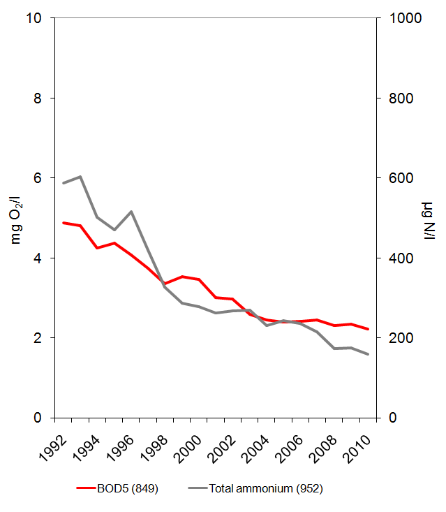See all EU institutions and bodiesConcentrations are expressed as annual mean concentrations. Only complete series after inter/extrapolation are included (see indicator specification). The number of river monitoring stations included per country is given in metadata (see downloads and more info). BOD7 data has been recalculated into BOD5 data.