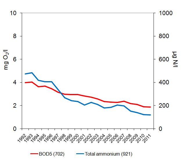 Concentrations are expressed as annual mean concentrations. Only complete series after inter/extrapolation are included (see indicator specification). The number of river monitoring stations included per country is given in metadata (see downloads and more info). BOD7 data has been recalculated into BOD5 data.