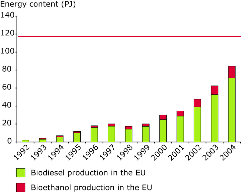 However, biofuel production in the 10 new EU countries was limited. The thick line (at 119 PJ) represents 1 % of road transport energy in the EU-25 Member States (EEA, 2006, Fact sheet 31). The horizontal line in the graph represents 1 % of road transport fuel consumption, equivalent to half of the 2005 target for biofuels consumption.