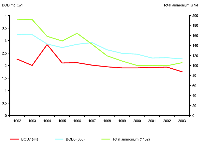 BOD5 data from Austria, Bulgaria, Czech Rep., Denmark, France, Hungary, Luxembourg, Slovak Rep. and Slovenia. BOD7 data from Estonia. Ammonium data from Austria, Bulgaria, Denmark, Estonia, Finland, France, Germany, Hungary, Latvia, Luxembourg, Poland, Slovak Rep., Slovenia, Sweden and the UK. Concentrations are expressed as median of annual average concentrations. Data are from representative river stations. Stations that have no designation of type are assumed to be representative and are included in the analysis. Consistent time series trends have been calculated using only stations that have recorded concentrations for each year included in the time series (see Methodology section for further details).