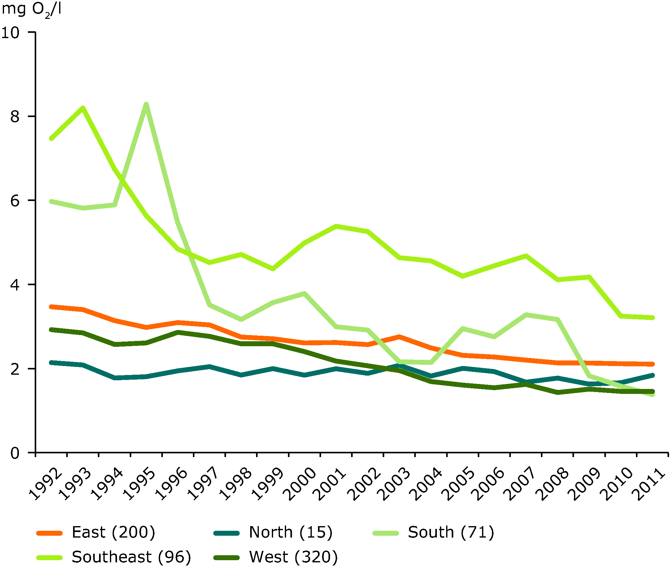 The data series per region are calculated as the average of the annual mean for river monitoring stations in the region. Only complete series after inter/extrapolation are included (see indicator specification). The number of river monitoring stations included per geographical region is given in parentheses. BOD7 data has been recalculated into BOD5 data.