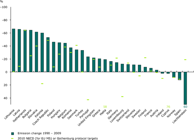Gothenburg protocol targets are shown for the non-EU countries (e.g. Switzerland and Norway). Neither Iceland nor Turkey has signed the Gothenburg protocol. Lichtenstein has signed but not yet ratified the Gothenburg protocol.