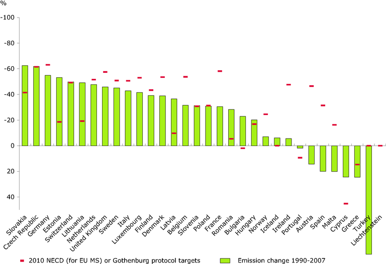 Gothenburg protocol targets are shown for the non-EU countries (e.g. Switzerland and Norway). Neither Iceland nor Turkey has signed the Gothenburg protocol. Liechtenstein has signed but not yet ratified the Gothenburg protocol. Emission data are not available for Liechtenstein.