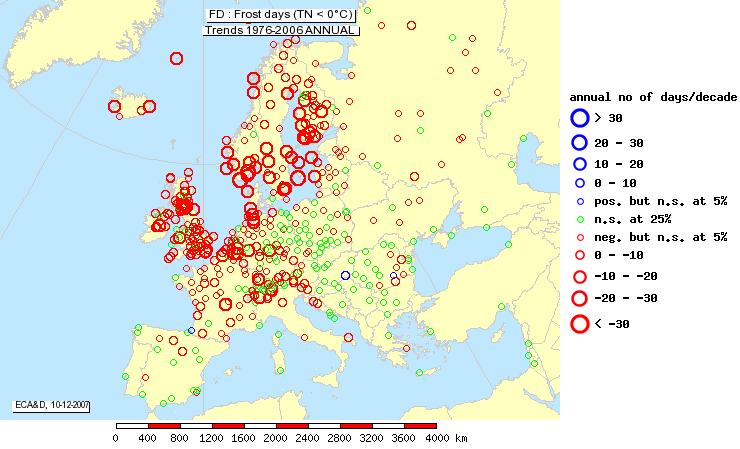 Positive values indicate cooling trend (increase in frequency) and negative values indicate a warming trend (decrease in frequency). The circle size depicts the magnitude of change in temperature per decade.