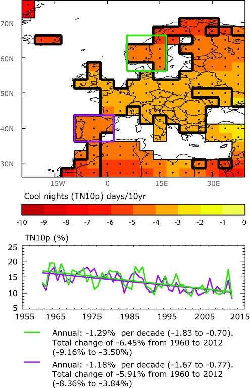 Positive values indicate cooling trend (increase in frequency) and negative values indicate a warming trend (decrease in frequency). Geographical coverage note: Europe