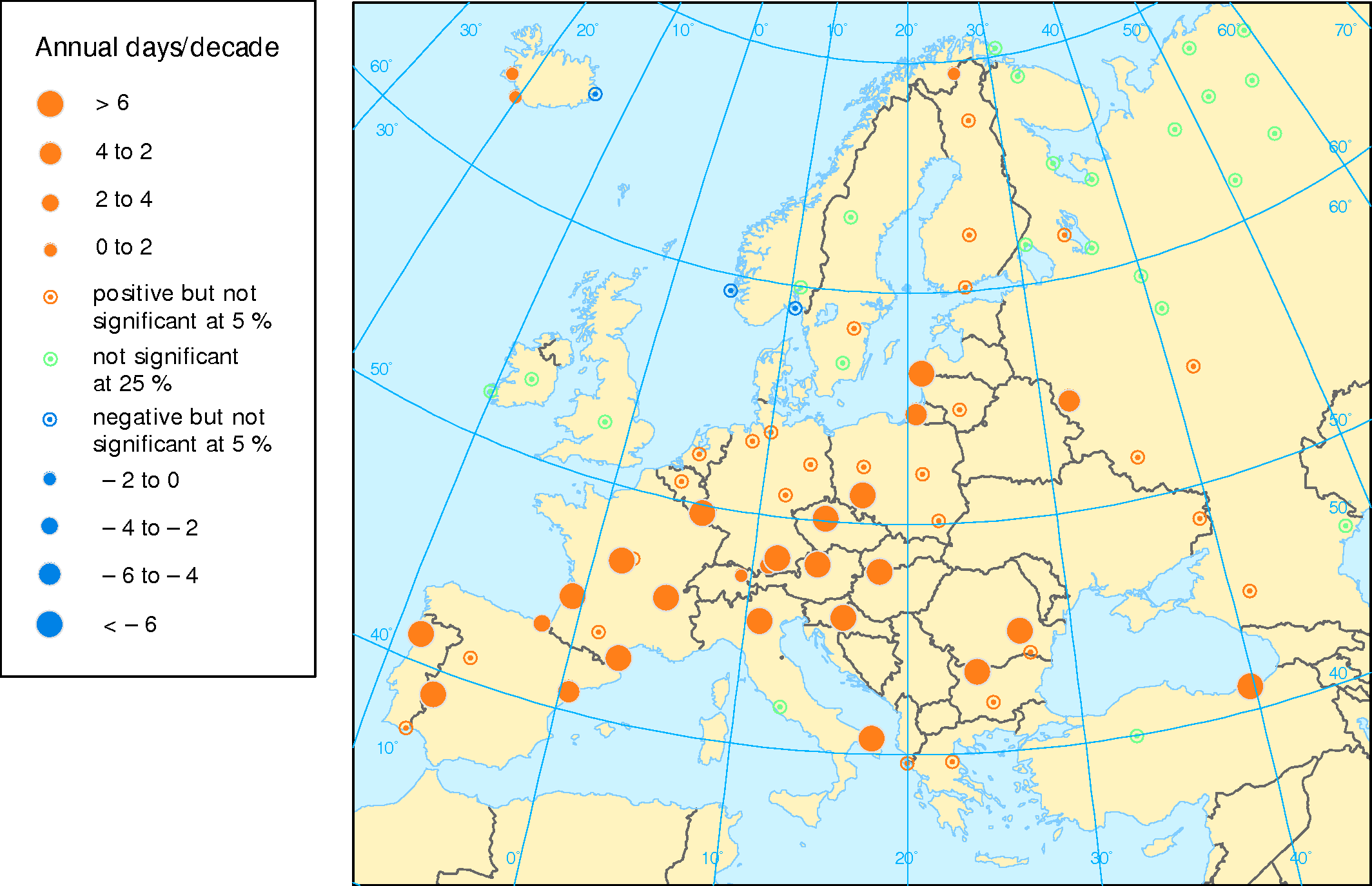 See all EU institutions and bodiesPositive values indicate increase and negative values indicate decrease of annaul summer days per decade