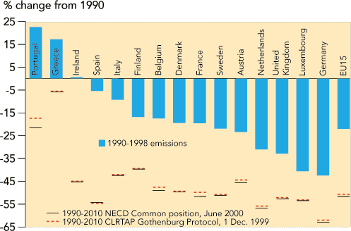 See all EU institutions and bodiesThe targets for 2010 are the Gothenburg Protocol target (December 1999) and the more recent NECD Common Position targets (June 2000) for the EU and individual countries for non-methane volatile organic compounds and nitrogen oxides individually