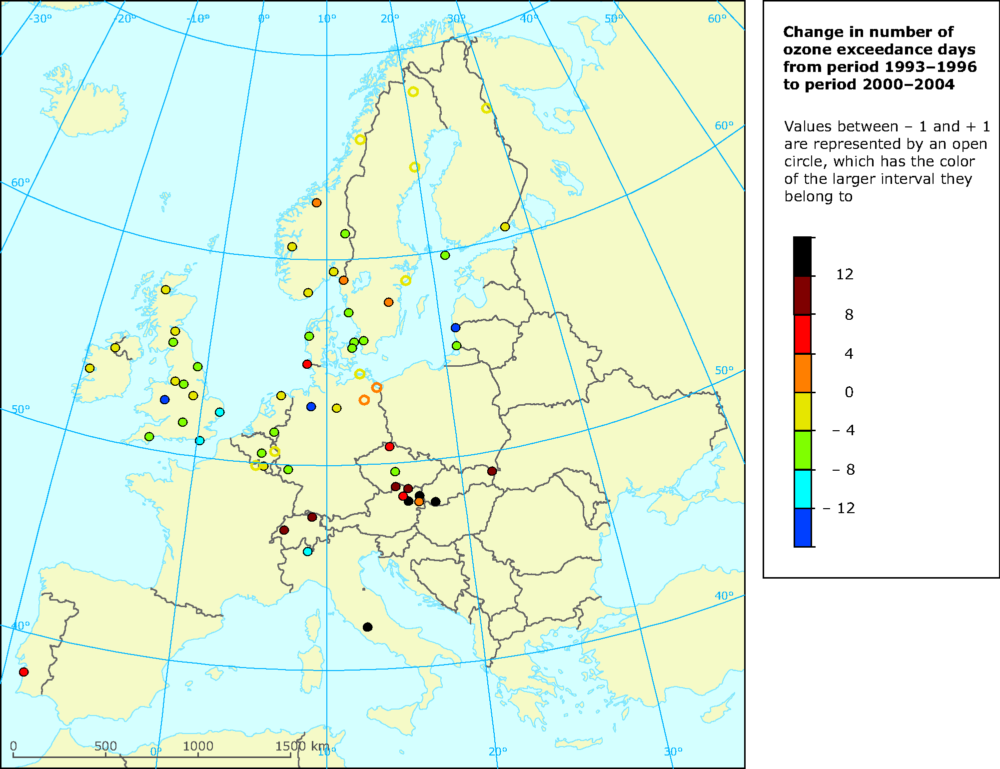 The map shows the change in the average number of ozone exceedence days from April to September observed at regional background stations (EMEP monitoring stations) from the period 1990-1994 to the period 1999-2004, excluding the abnormally warm summer of 2003. A day is counted as an exceedence day when the daily maximal 8-hr-average ozone concentration exceeds 60 ppbV.