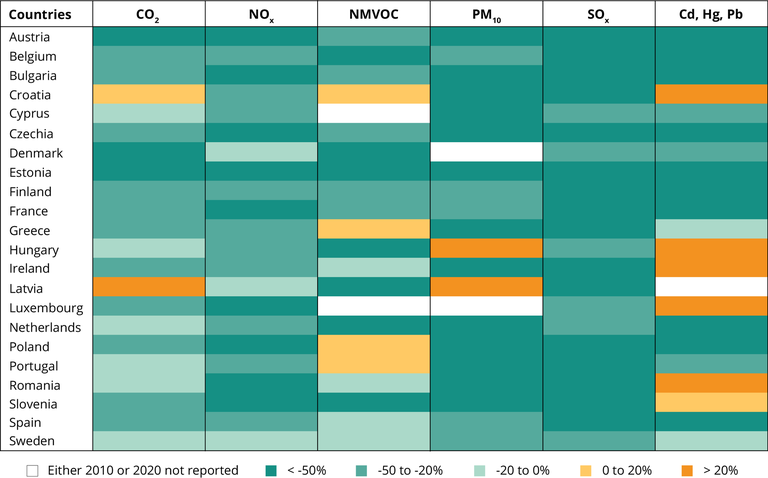 Change in pollutant releases to air in the EU-27 countries, 2010-2020