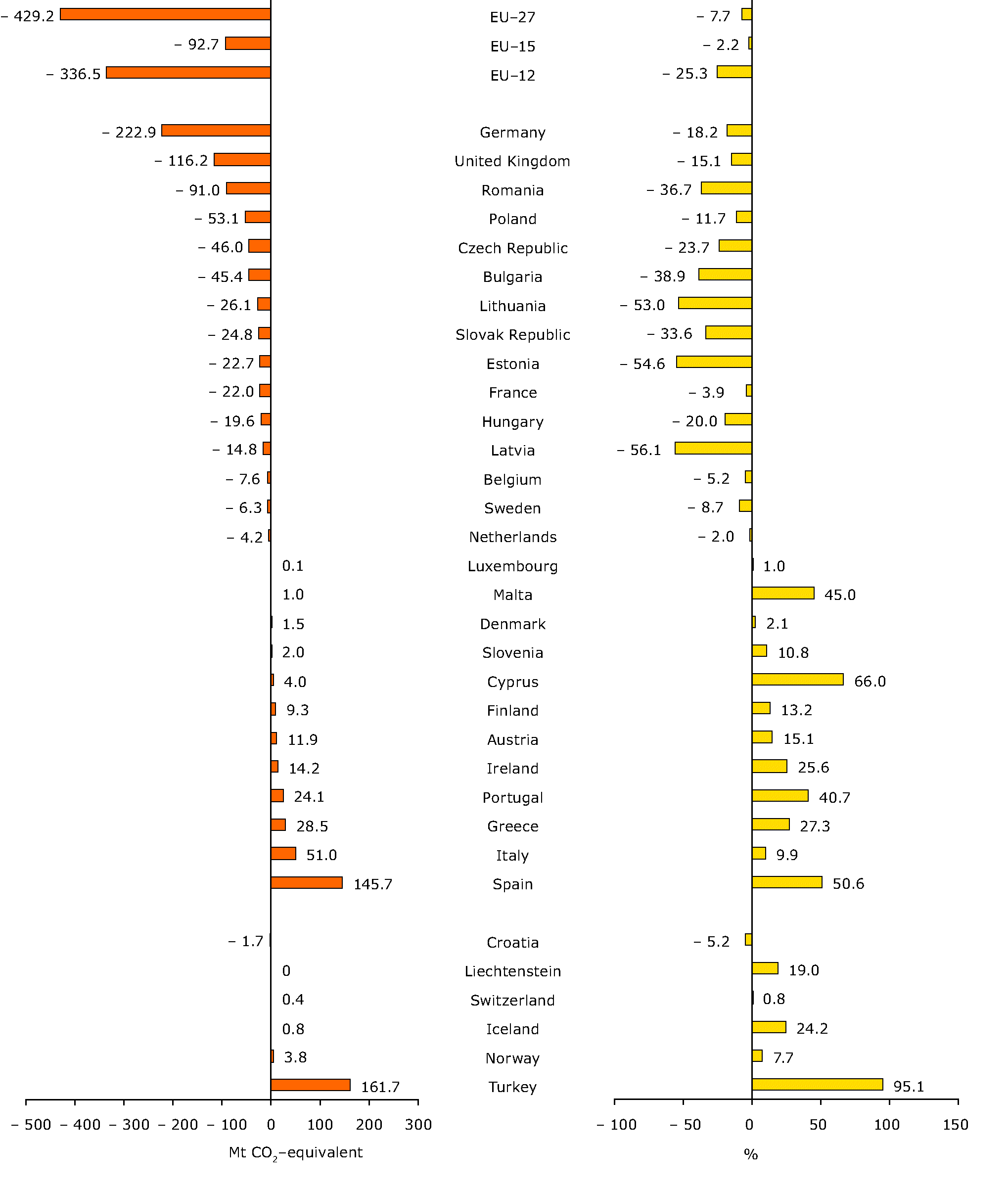 Changes in greenhouse gas emission trends in Europe between 1990 and 2006