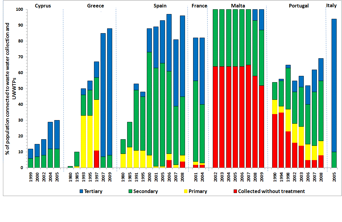 Data source: Data table: "Resident population connected to wastewater collection and treatment systems" reported to the "OECD/Eurostat Joint Questionnaire - Inland Waters-2010", (version as of June 26, 2013). Data are available at Eurostat data table.