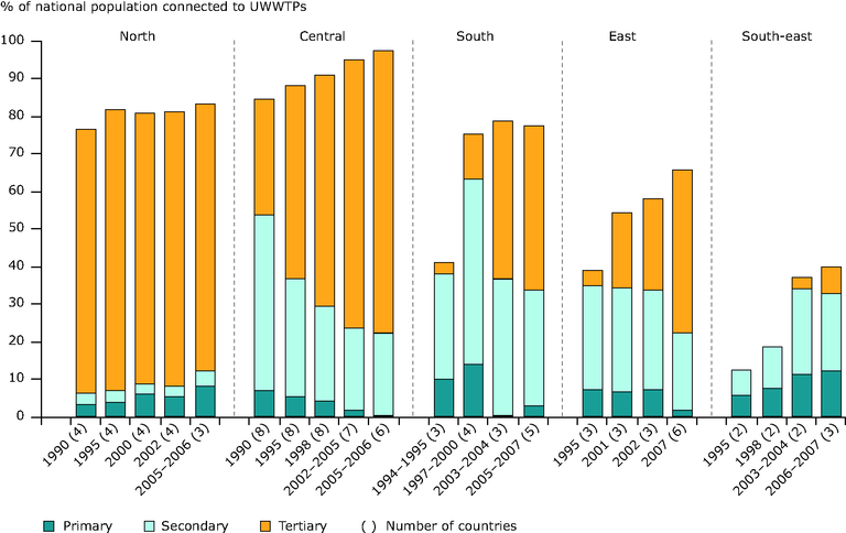 Only countries with data from (almost) all periods were included, the numbers of countries are given in parentheses, see the country information per region in CSI024 Assessment 2010 Fig. 2 to 6. (http://www.eea.europa.eu/data-and-maps/indicators/urban-waste-water-treatment/urban-waste-water-treatment-assessment-2)