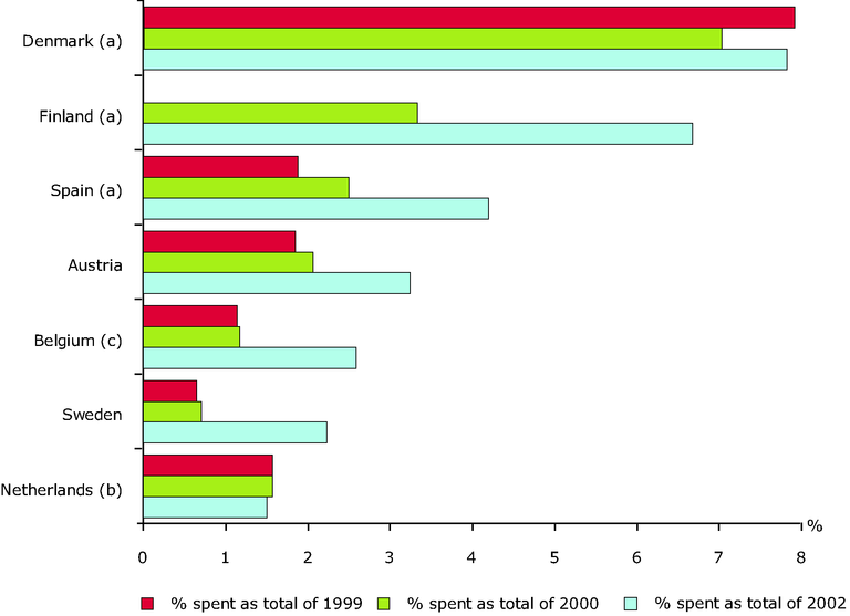 See all EU institutions and bodies(a) Total expenditures taken from 2000 estimation also for 2002 (b) Netherlands: average value (23.000 - 46.000 Mio Euro) for 1999 and 2000
