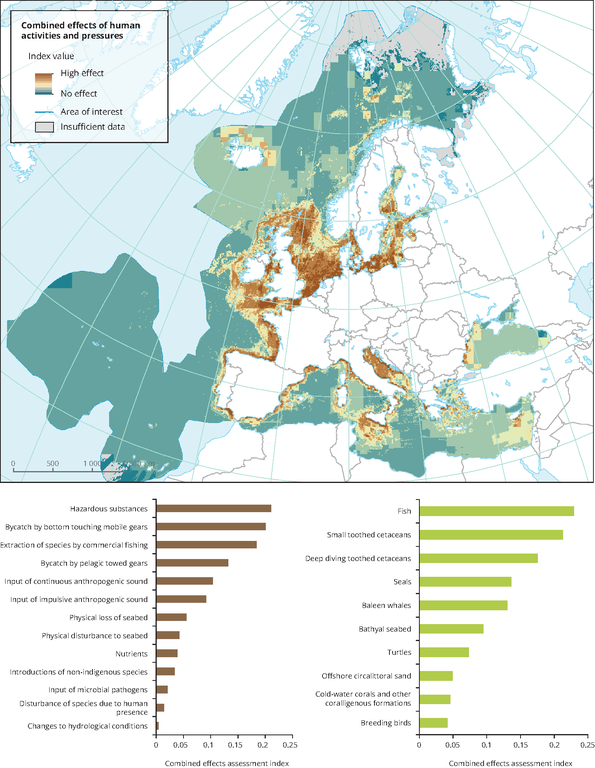 See all EU institutions and bodiesThe map describes combined effects index values for pressures caused by human activities. The relative values indicate areas where the pressures potentially affect the marine ecosystem.