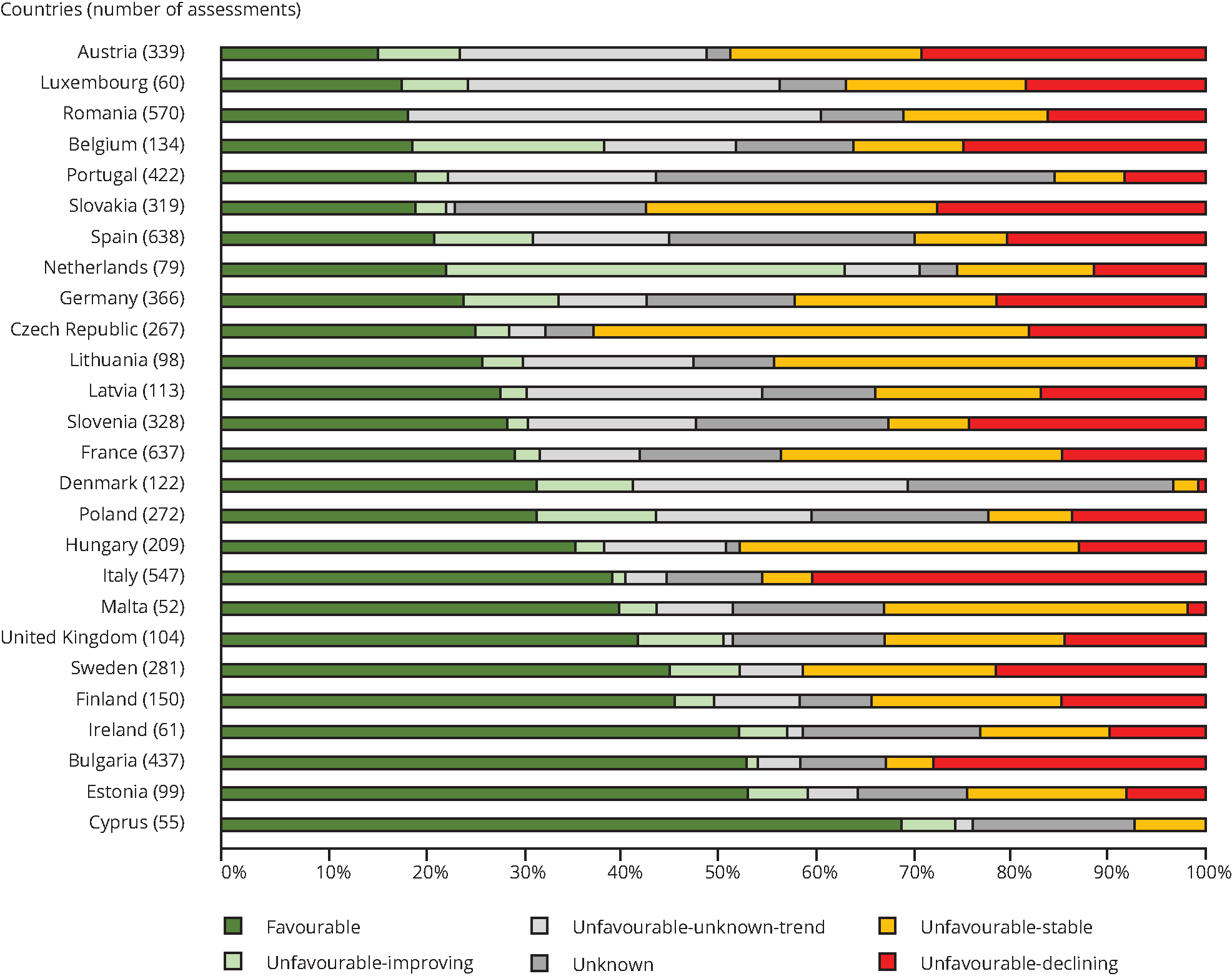 Art. 17 of the Habitats Directive, non-bird species assessments, favourable conservation status, unfavourable-improving trend in conservation status, unfavourable-unknown trend in conservation status, unknown trend in conservation status, unfavourable-stable trend in conservation status, unfavourable-declining trend in conservation status.