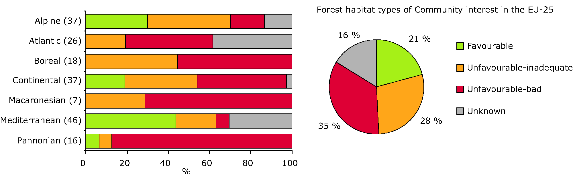 Conservation status of habitats per biogeographic area in forest ecosystems. Statistics by region on the left, overall statistics on the right.