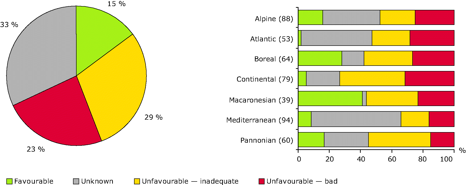 Conservation status of species per biogeographical area in forest ecosystems. Statistics by region on the left, overall statistics on the right.