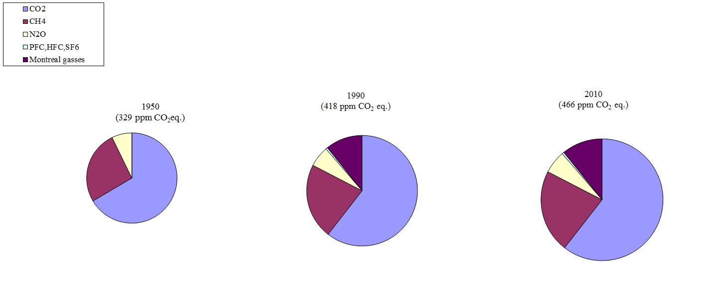 The size of the pies depicts the size of the relative increase in GHG concentration.