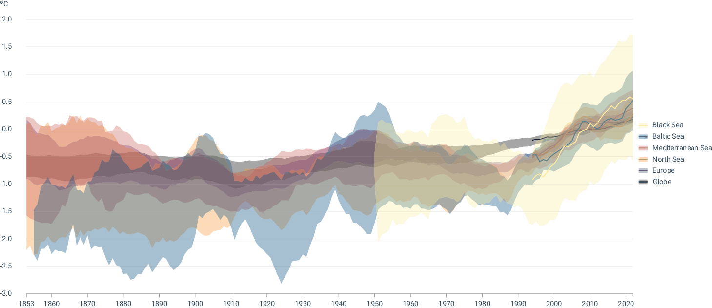 Due to lack of observations during some periods of 19th century and first half of 20th, Black Sea is only represented from the 1950s onward.