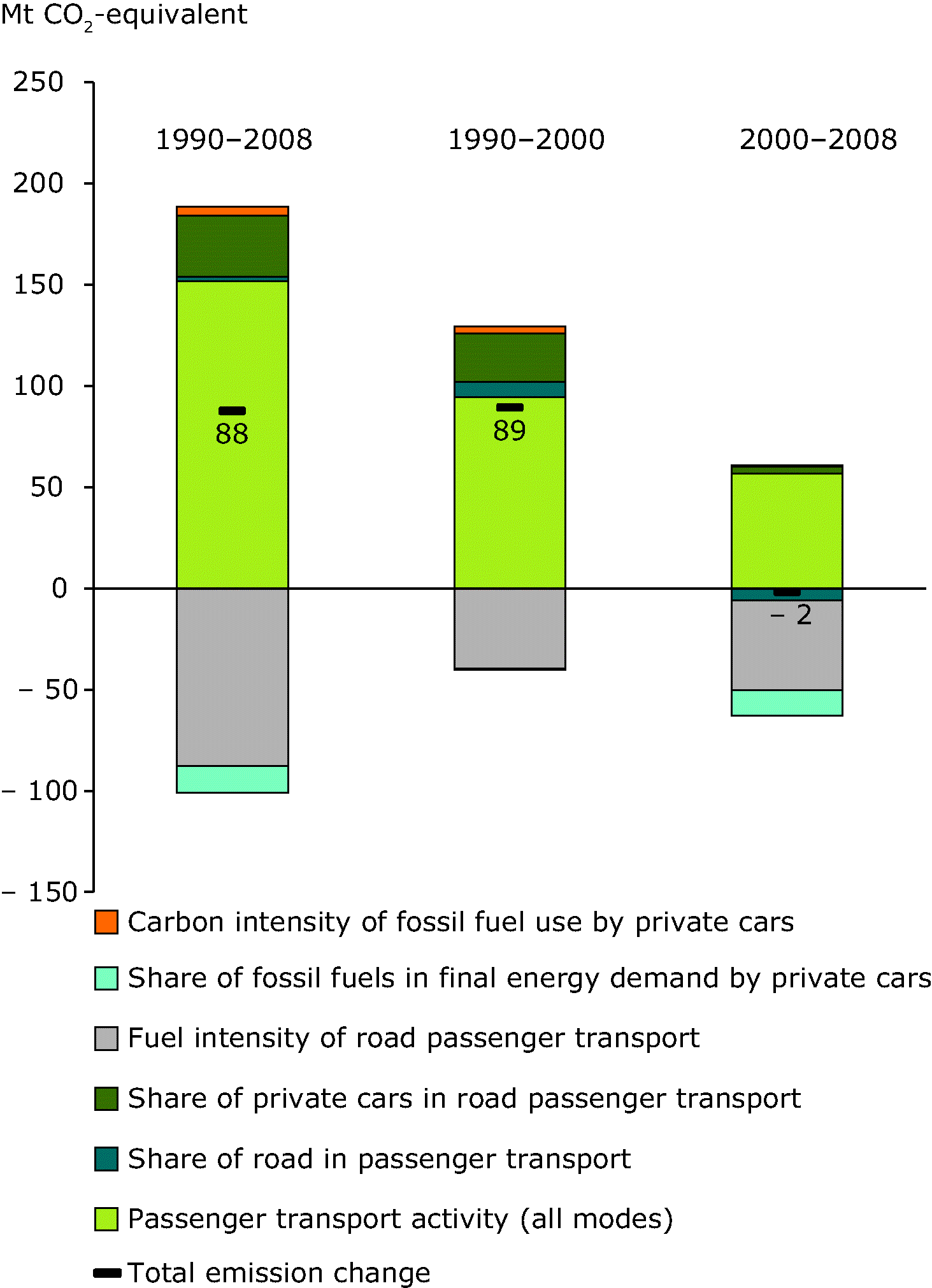See all EU institutions and bodiesEach bar shows the contribution of a single driver to CO2 emission trends during a determined period. The thick short black lines indicate the combined effect of all emission drivers, i.e. the overall GHG emission trend during the period considered.