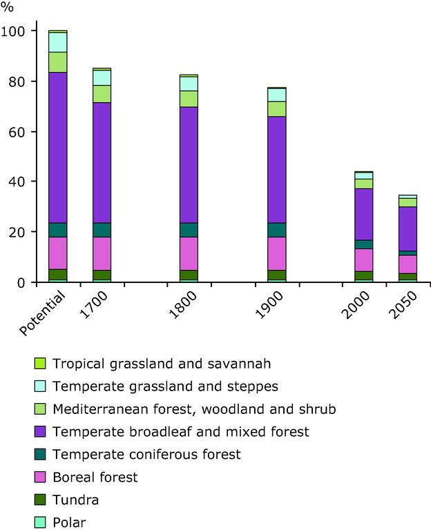 Graph is for development of biodiversity in Europe (1700-2050).