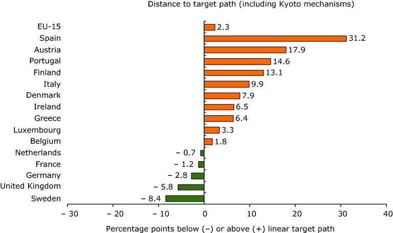 See all EU institutions and bodiesThe distance-to-target indicator (DTI) measures the deviation in percentage points of actual emissions in 2004 from a (hypothetical) linear path between base-year emissions and the burden-sharing target for 2010
