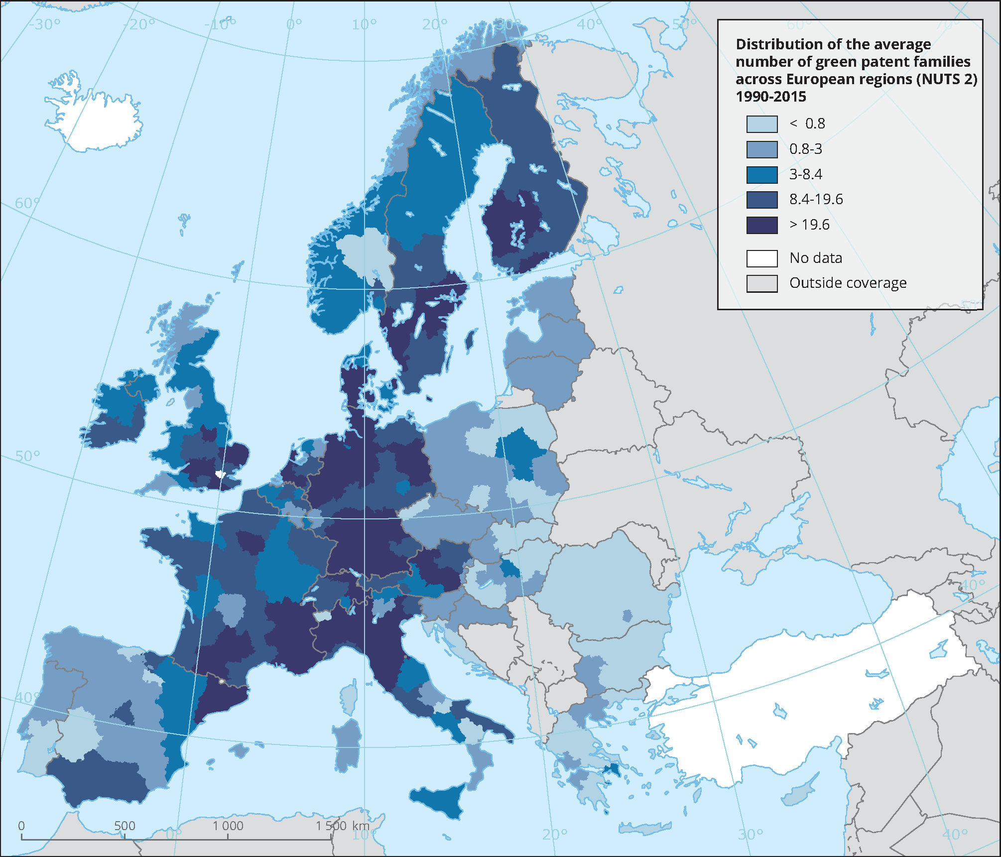 See all EU institutions and bodiesThe map shows the quintiles of the geographical distribution of green patent families at regional level