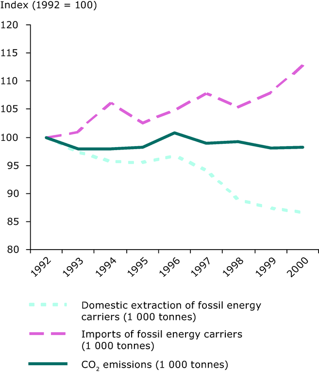 Domestic extraction and imports of fossil fuels, and CO2 emissions, EU25