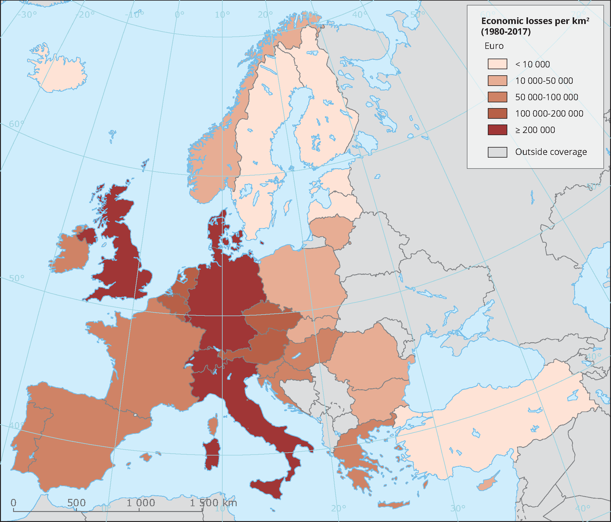 For the period 1980-2017, in Euro 2017 prices, based on the damage records from the NatCatSERVICE of Munich Re and the EUROSTAT structural indicators.