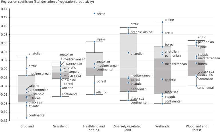 Productivity time series 2000-2016 (one value per year) over pixels with significant (p < 0.1) productivity trends were regressed against a time series of temperature, 2000-2016, yearly averages. Using the Corine Land Cover (CLC) 2000-2018 series, only those grid cells were considered in this analysis where the CLC layers indicated no land use change between 2000-2018. The dependent productivity variable and the explanatory variable of temperature were normalised and detrended before the regression runs. Significance of the regression coefficient was measured as p < 0.1. Due to standardizing all variables results are presented in standardized regression coefficients that show the change in the dependent variable measured in standard deviations.