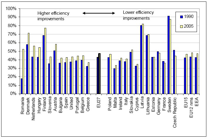 Efficiency (electricity and heat) from public conventional thermal plants, 1990 and 2005