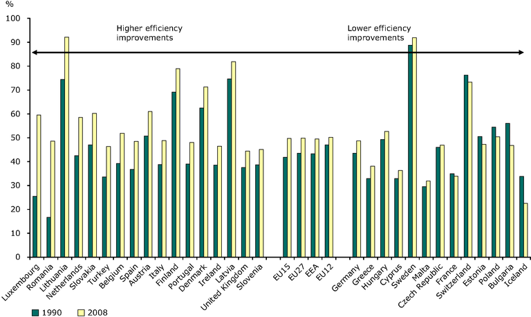 The EEA efficiencies exclude Norway (for conventional), and Norway and Switzerland (for public conventional) - their efficiencies are above 100% in either 1990 or 2008 because the electricity consumed for heating is not considered as an input although the heating from electric boilers is considered in total output. Swedish conventional and public conventional efficiencies are above 100% in some years (when including district heating), but not in 1990 or in 2008, so Sweden is included in the charts.