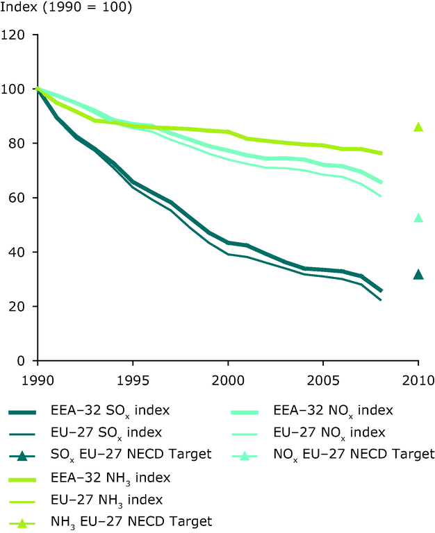 See all EU institutions and bodiesThis chart shows past emission trends of nitrogen oxides (NOx), sulphur oxides (SOx) and ammonia (NH3) in the EEA-32 and EU-27 group of countries. In addition - for the EU-27 - the aggregated Member State 2010 emission ceiling for the respective pollutants are shown.
