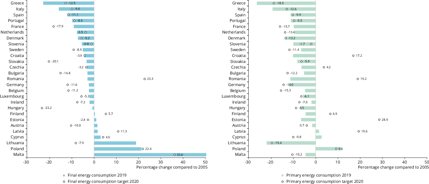 In accordance with the Energy Efficiency Directive (2012/27/EU), the EU Member States have set up national indicative targets that, collectively, should help the EU to reach its 20 % energy efficiency target by 2020. This chart shows their change in consumption in 2019 compared to 2005, and their 2020 targets.