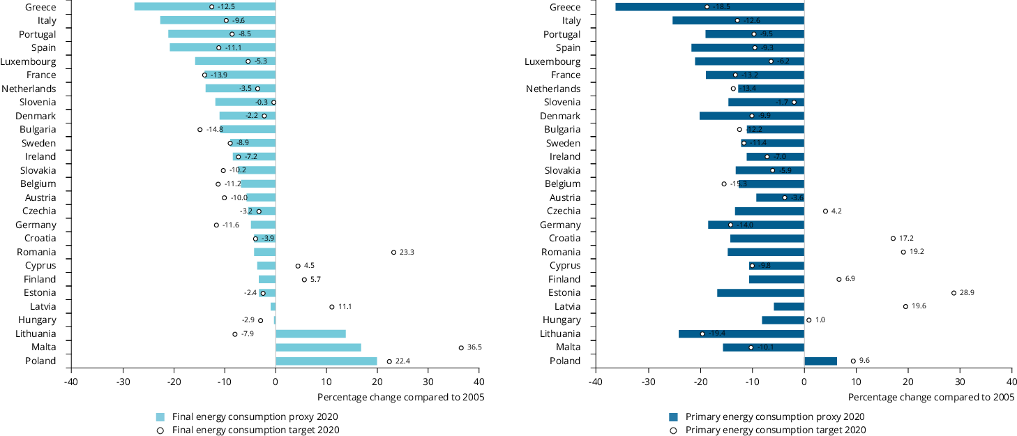 In accordance with the Energy Efficiency Directive (2012/27/EU), the EU Member States have set up national indicative targets that, collectively, should help the EU to reach its 20 % energy efficiency target by 2020. This chart shows their change in consumption in 2020 compared to 2005, and their 2020 targets.