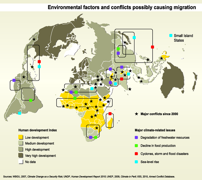 See all EU institutions and bodiesColors show Human development Index ranking. Symbols locate possible causes of displacements: environmental upheavals related to climate change and major conflicts since 2000.