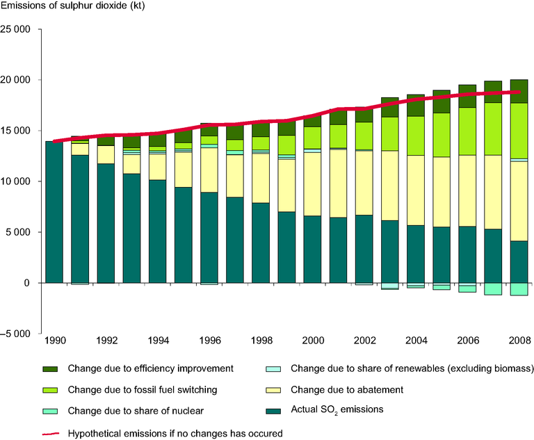 The chart show the estimated contributions of the various factors that have affected emissions from public electricity and heat production (including public thermal power stations, nuclear power stations, hydro power plants and wind plants). The top line represents the hypothetical development of emissions that would have occurred due to increasing public heat and electricity production between 1990 and 2008, if the structure of electricity and heat production had remained unchanged from 1990 (i.e. if the shares of input fuels used to produce electricity and heat had remained constant, the efficiency of electricity and heat production also stayed the same and no additional abatement technologies had been introduced). However, there were a number of changes to the structure of electricity and heat production that tended to reduce emissions and the contributions of each of these changes to reducing emissions are shown in each of the bars. The cumulative effect of all these changes was that emissions from electricity and heat production actually followed the trend shown by the black bars. This is a frequently used approach for portraying the primary driving forces of emissions. The explanatory factors should not be seen as fundamental factors in themselves nor should they be seen as independent from each other.