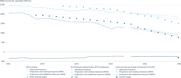 See all EU institutions and bodiesThis figure shows the EU-27 greenhouse gas emission targets, historical and future emission trends of emissions covered by the Effort Sharing legislation, the EU Emission Trading System (ETS) and the Land Use, Land Use Change, and Forestry sector (LULUCF).